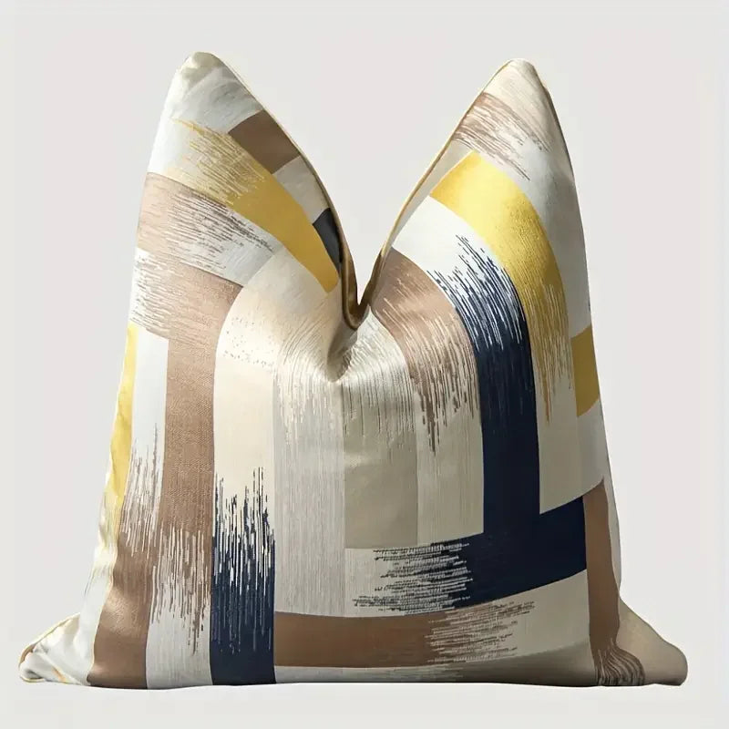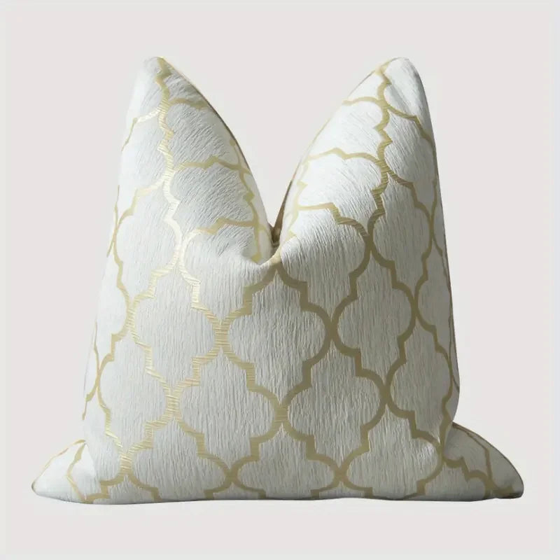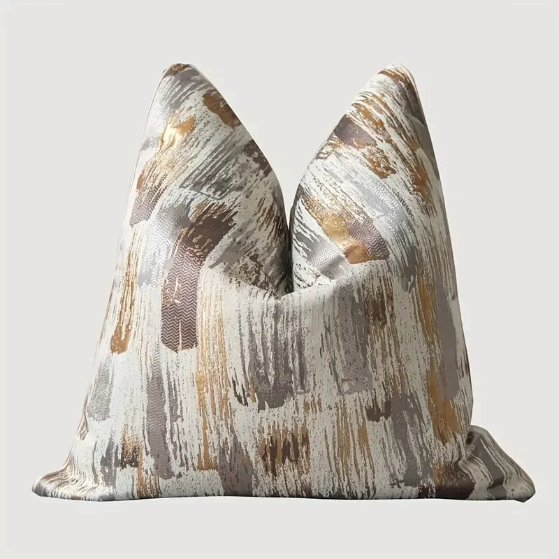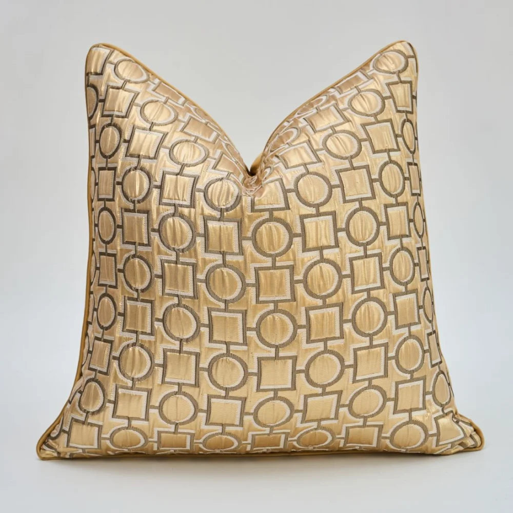 Dekoratyvinis pagalvėlės užvalkalas su aukso spalvos geometrinėmis detalėmis sukurtas tiems, kurie vertina šviesią prabangą ir elegantišką modernumą. Aukštos kokybės žakardinis audinys pasižymi tvirtumu ir ilgaamžiškumu, o kruopščiai išaustas raštas atrodo stilingai ir rafinuotai. Daugiaspalvis pagrindas puikiai dera su įvairiais interjero tonais – nuo neutralių iki sodrių. Tinka naudoti svetainėje, miegamajame ar net terasoje – visur, kur norisi šiek tiek prabangos.